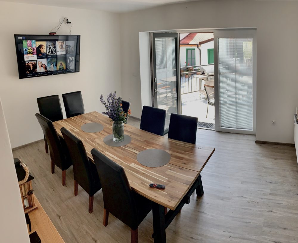 Nabízíme ubytování ve vinařské obci Kobylí na jižní moravě. K pronájmu je CELÝ DŮM (max. 14 osob) pro maximum soukromý, nebo APARTMÁN (max. 6 osob). DŮM má 3 ložnice vždy s nezávislým vstupem a vlastní koupelnou, plně zařízenou kuchyň, velkou společenskou místnost, saunu. APARTMÁN má vlastní vstup, ložnici, obývací pokoj, kuchyň, koupelnu a vlastní terasu, je klimatizováno. Vše je nové, moderní, čisté.